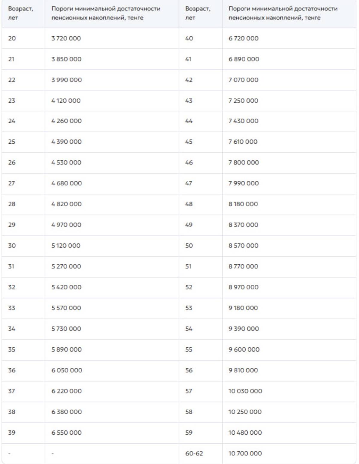 В среднем пороги повышены на 10 процентови составили от 3,72 до 10,7 миллиона тенге в зависимости от возраста.