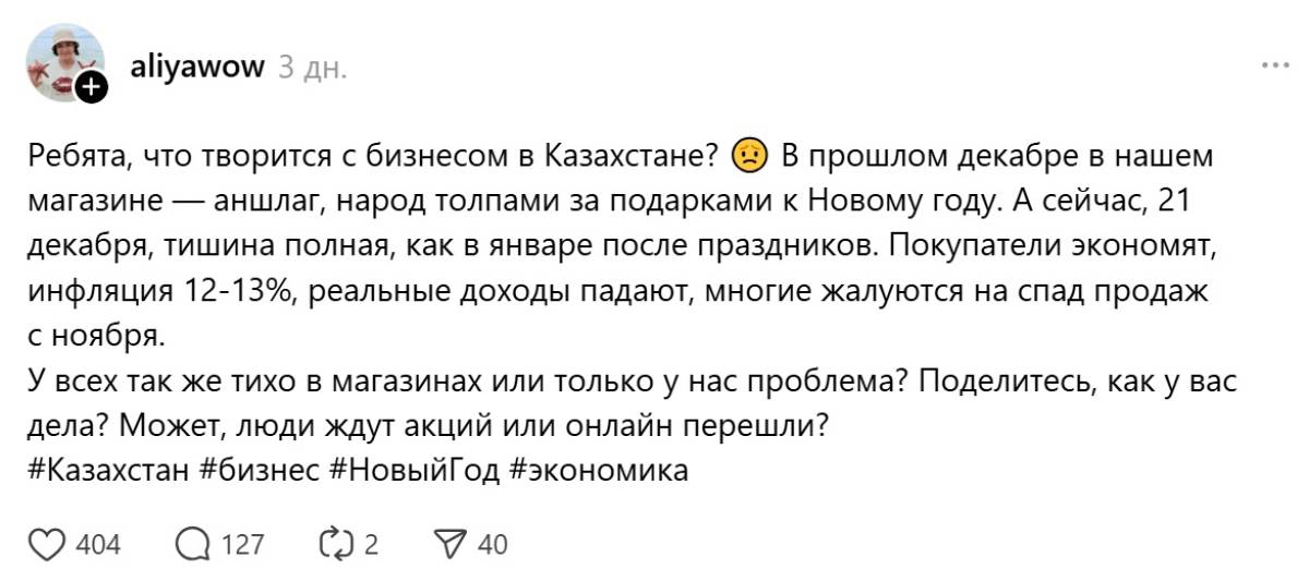 В Казахстане перед Новым годом все чаще говорят не о праздничных распродажах, а о тишине в магазинах. Поводом для обсуждения стала популярная ветка в соцсети Threads, где предпринимательница под ником aliyawow рассказала о резком падении продаж в своем магазине – несмотря на предновогодний период, который традиционно считается «золотым» для торговли, передает Arasha.kz со ссылкой на digitalbusiness.kz.