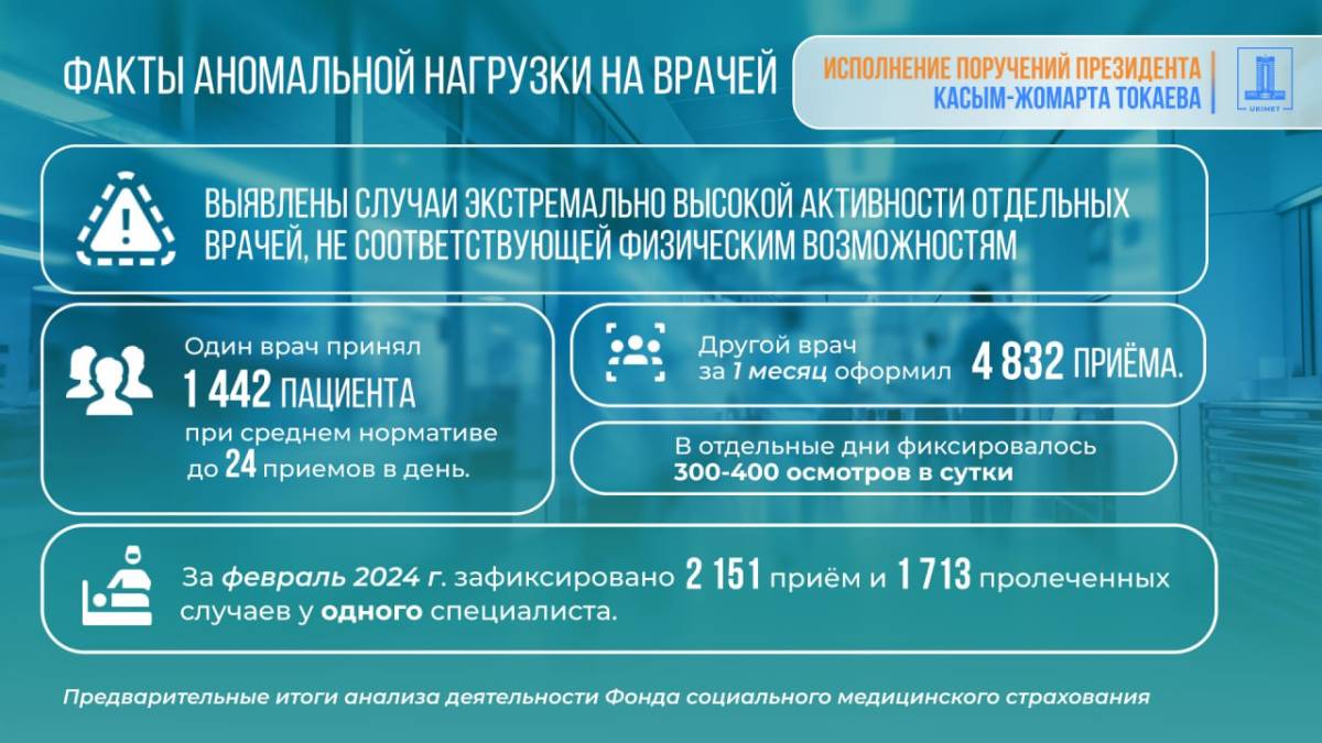 - 1 713 пролеченных случаев за месяц у одного специалиста, в отдельные дни – 300–400 осмотров в сутки (г. Астана).