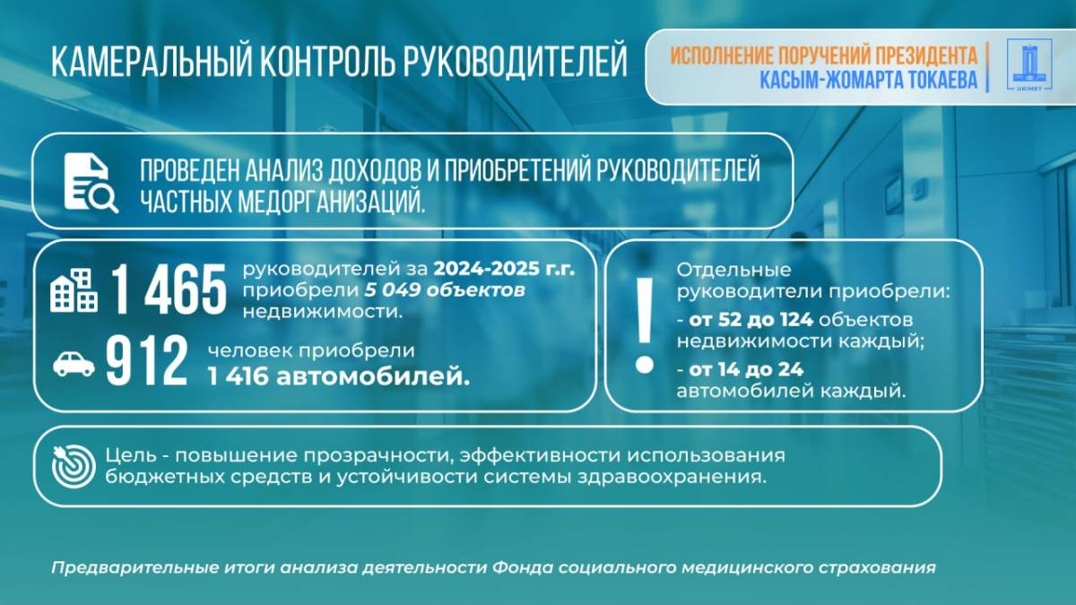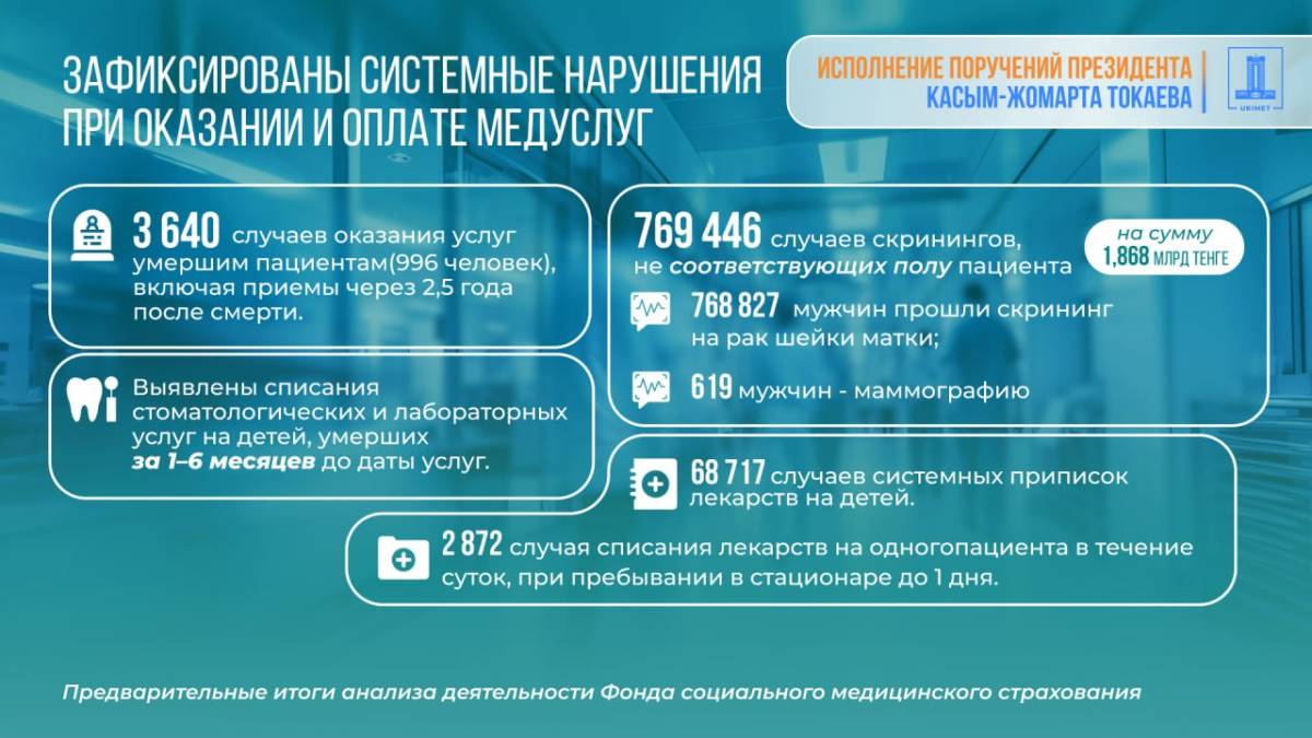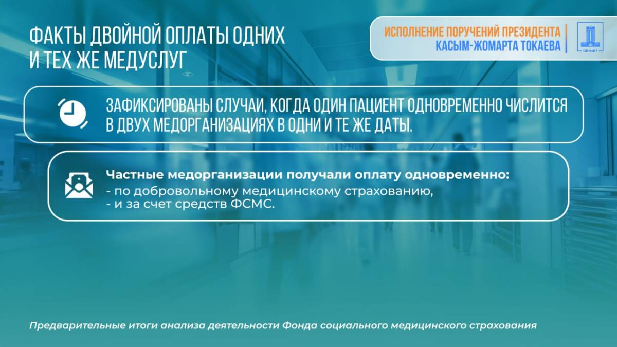 По итогам проведенного анализа Министр финансов Мади Такиев доложил, что несмотря на рост бюджетных расходов (в 2026 году расходы на эти цели составят 2,4 трлн тенге, что на 1 трлн тенге больше, чем в 2020 году) эффективность Фонда не растет. При этом накопленный инвестиционный доход с 2020 года составил 588 млрд тенге, в том числе только за 2025 год 195,9 млрд тенге. Согласно анализу, значительная часть средств аккумулируется в активах Фонда и не направляется на оказание медицинских услуг.