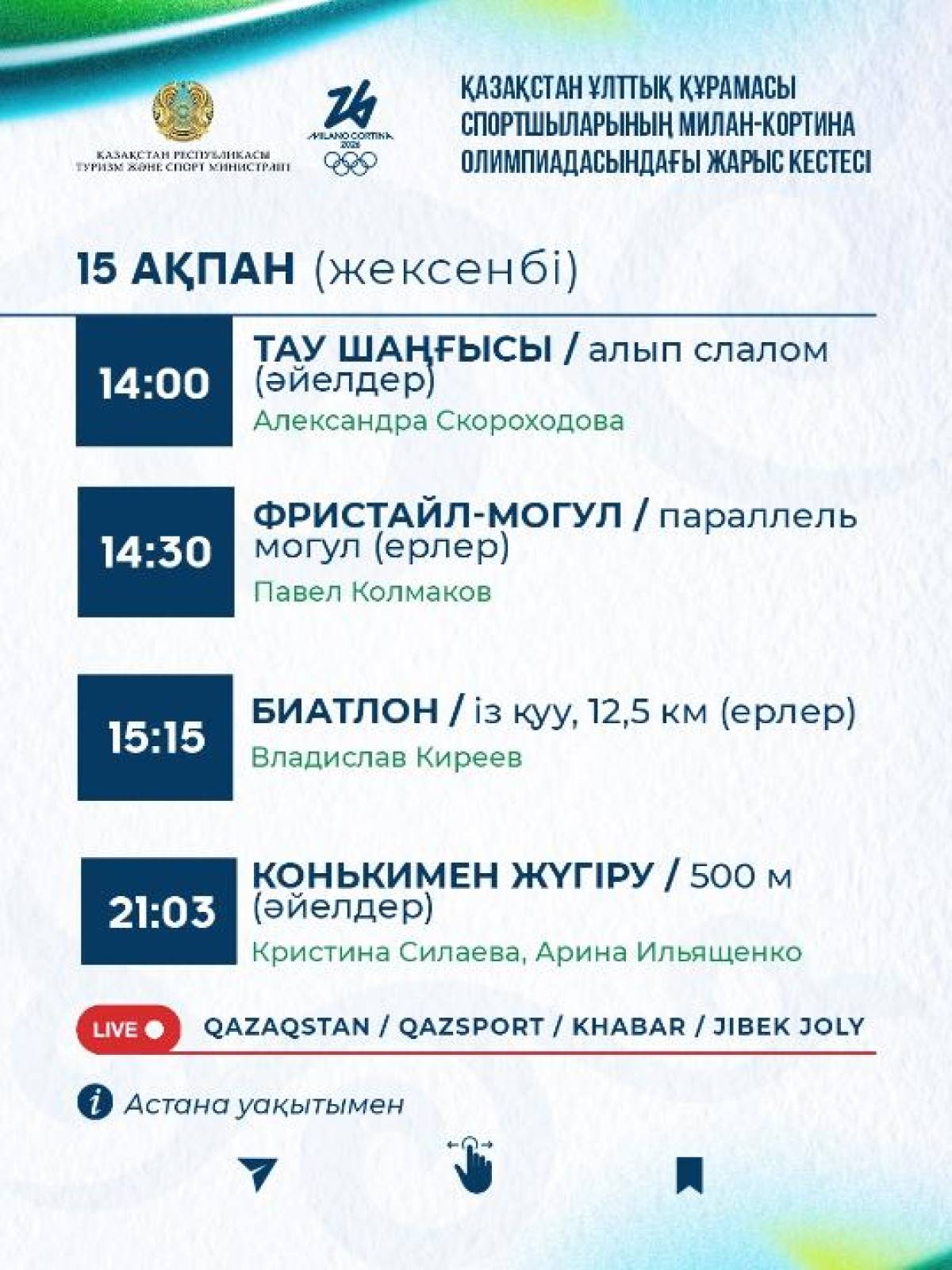 Все соревнования проходят по времени Астаны. Выступления казахстанских спортсменов транслируются в прямом эфире отечественных телеканалов.