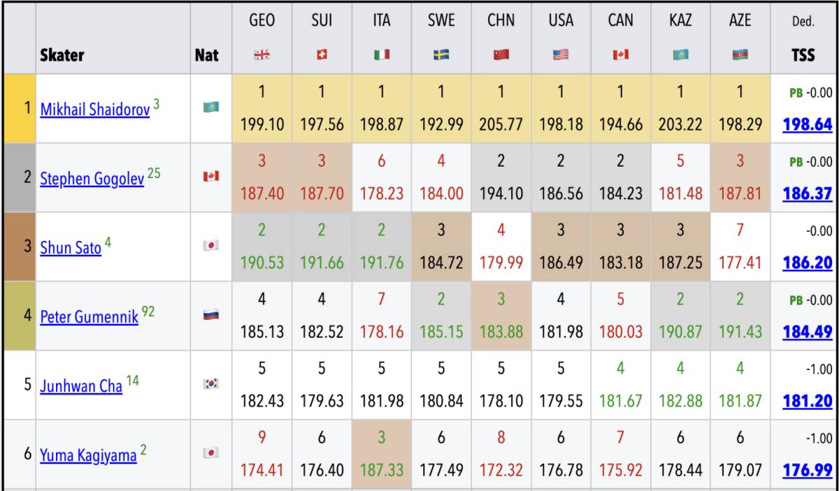 Если посмотреть на детализацию судейских оценок, то выяснится, что каждый из девяти судей довольно субъективно оценивает катание спортсменов.