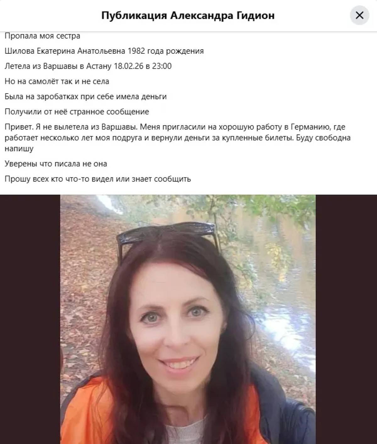 "Пропала моя сестра. Шилова Екатерина Анатольевна, 1982 года рождения. Летела из Варшавы в Астану 18:02:26 в 23:00. Но на самолет так и не села. Была на заработках, при себе имела деньги", – говорится в объявлении.