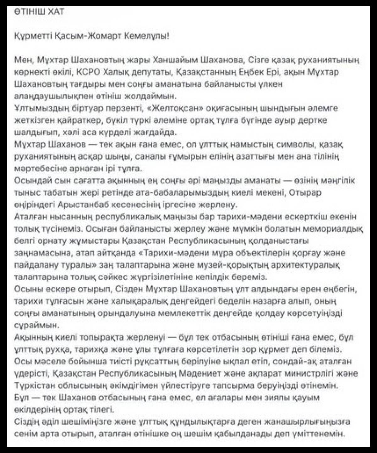 После его смерти в сети появилось обращение супруги поэта Ханшайым Шахановой к Президенту Казахстана Касым-Жомарту Токаеву. В письме она сообщает о последней воле Муxтара Шаханова и просит оказать содействие в решении вопроса его захоронения.