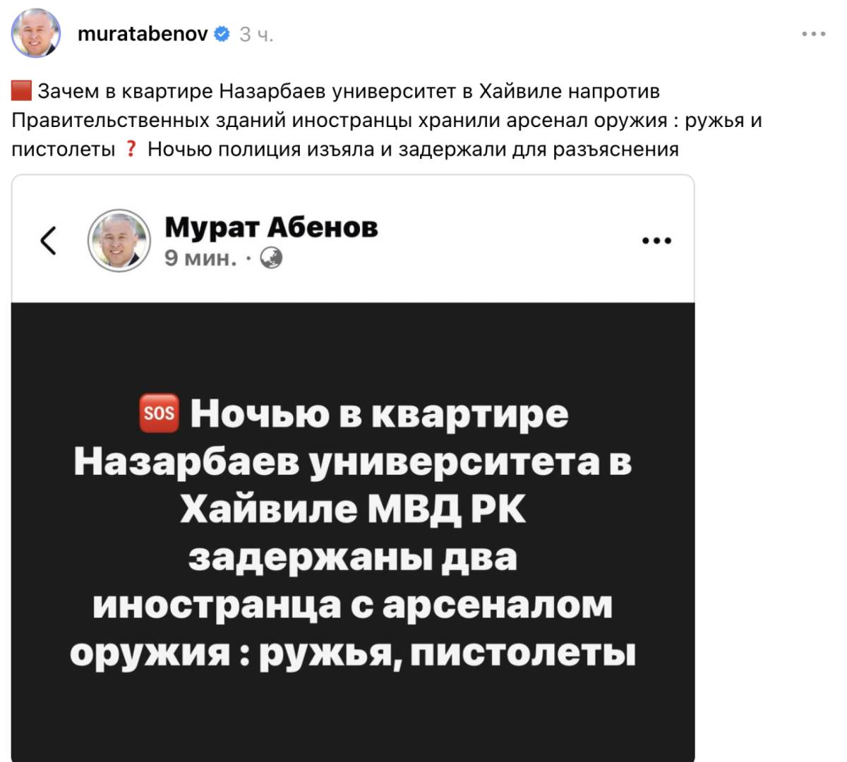 По словам Абенова, ночью в квартире одного из ЖК в Астане сотрудники МВД, предположительно, задержали двух иностранцев с оружием.